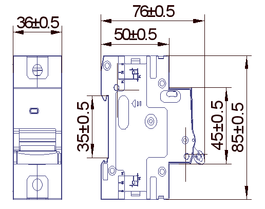產(chǎn)品采用 35mm 標準導軌安裝,單模尺寸為:76×85×36(mm),未標注公差:±0.5mm。如下列圖所示(單位:mm):