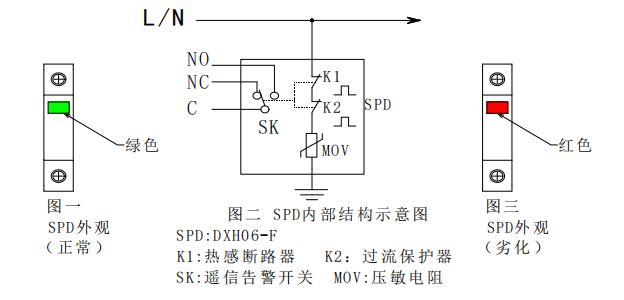 2 浪涌保護(hù)器正常工作時,告警干接點(diǎn)為導(dǎo)通狀態(tài);浪涌保護(hù)器失效時,狀態(tài)指示變紅色,同時告警干接點(diǎn)為開路狀態(tài)。