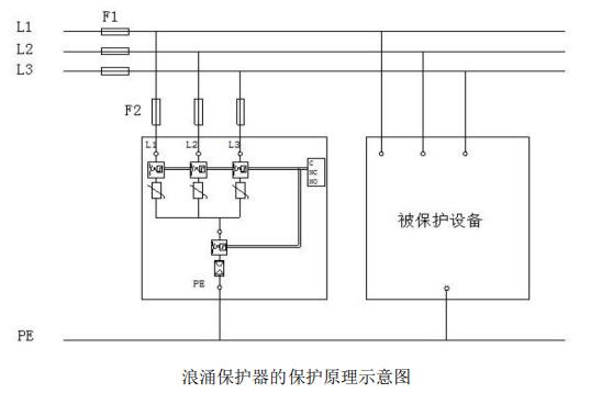 交流浪涌保護(hù)器用于交流電源的第二級(jí)(C 級(jí))雷電過電壓保護(hù),三相浪涌保護(hù)器采用-3防護(hù)電路,如下圖所示。